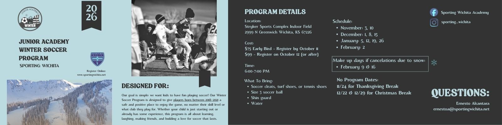 All participants MUST register and pay for their session online. An open registration will be offered on our website, www.sportingwichita.net. Basic player information will be required as well as medical release of the player for filing purposes. Online waivers will be also electronically signed by the parent and kept on file.