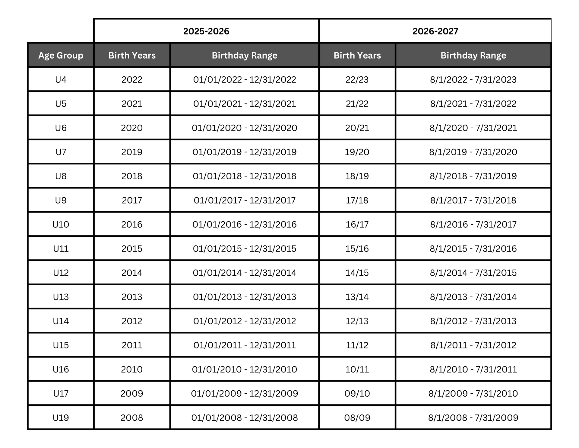 This change will take effect with our 2026-27 team formations and tryouts this upcoming spring/summer. All players will be expected to try out in their correct age group based on this new mandate.