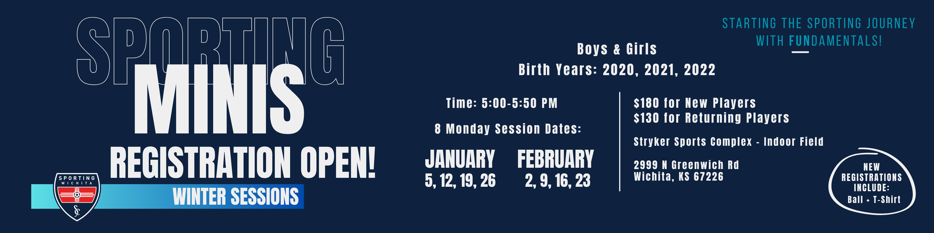 All participants MUST register and pay for their session online. An open registration will be offered on our website, www.sportingwichita.net. Fees will be determined at each session offer. Basic player information will be required as well as medical release of the player for filing purposes. Online waivers will be also electronically signed by the parent and kept on file.